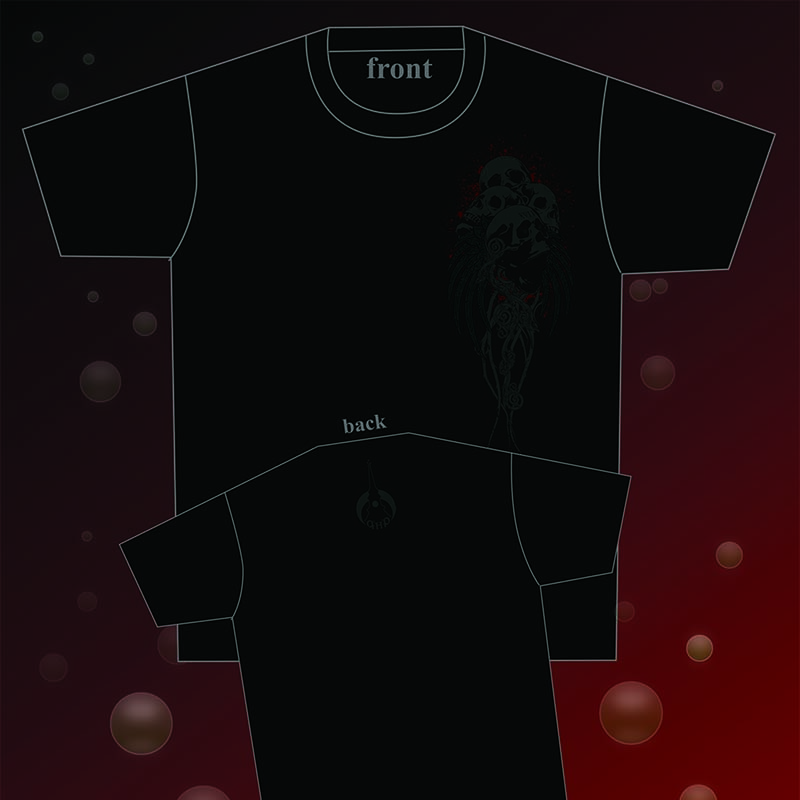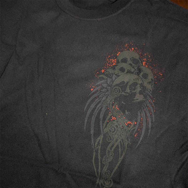 This 2011 shirt features skulls and feathers and was designed by Chris Smith. The design is gray on black so very subtle and appears on the left side of the shirt.