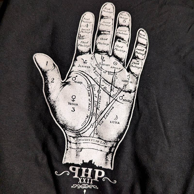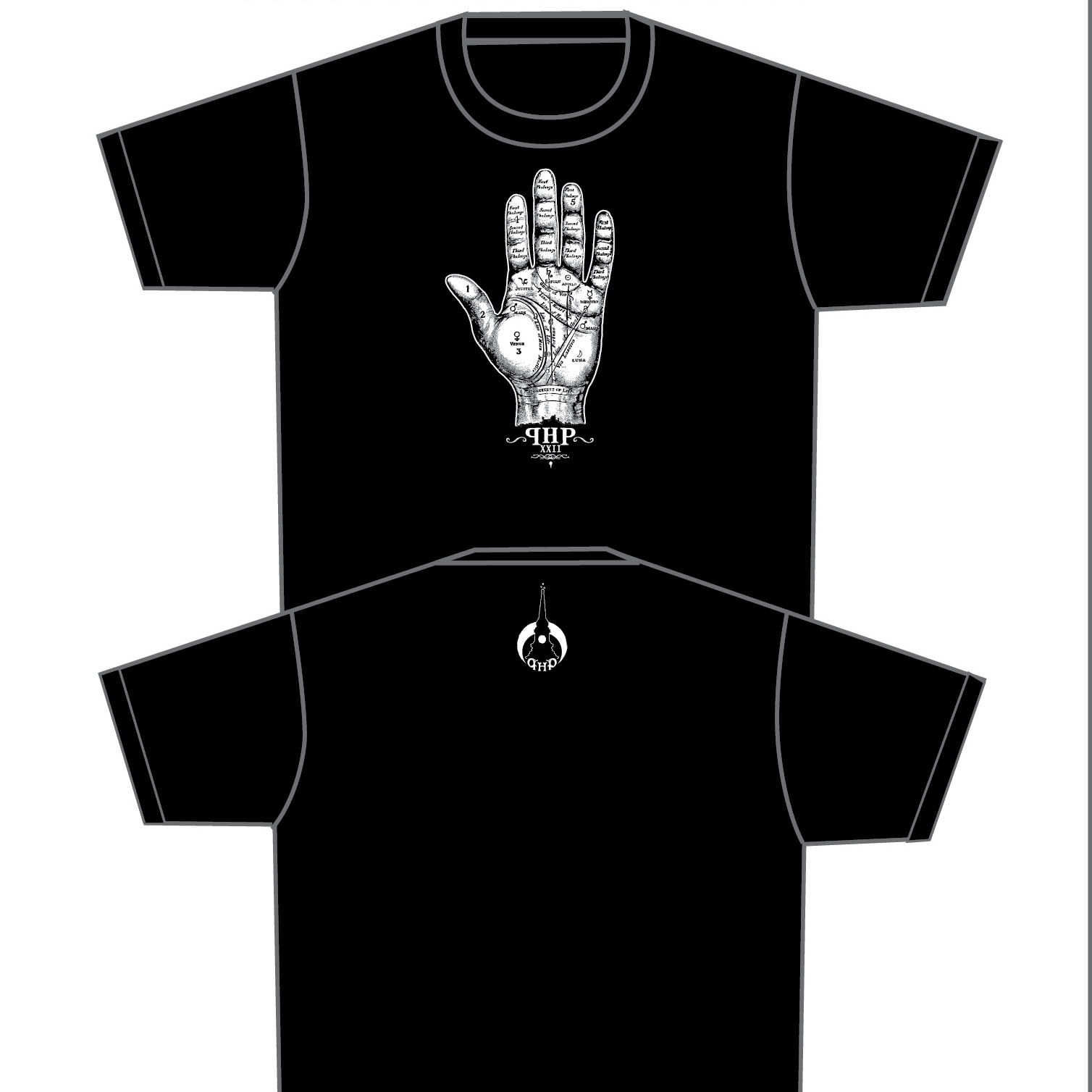 This 2016 shirt features a hand with palmistry markings. It was designed by Chris Smith. The design is white on black.